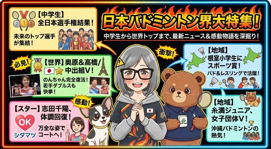今日のニュースは、日本バドミントン界の「今」と「未来」を力強く感じさせるものばかりでしたね!若き才能が躍動する全日本中学生選手権から、ベテラン奥原選手の復活優勝、そして若手高橋・中出ペアの躍進といった国際大会での朗報。さらには、根室市や沖縄の地域に根ざしたスポーツ振興の温かいニュース。そして何より、多くのファンが心配していた志田千陽選手の体調回復の知らせは、本当に嬉しい限りです。